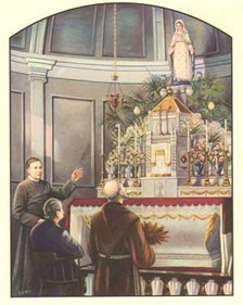 Depiction of Pierre Lacroix, with Father Luc Desilets and Father Frederic during the apparition